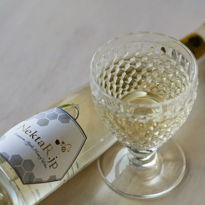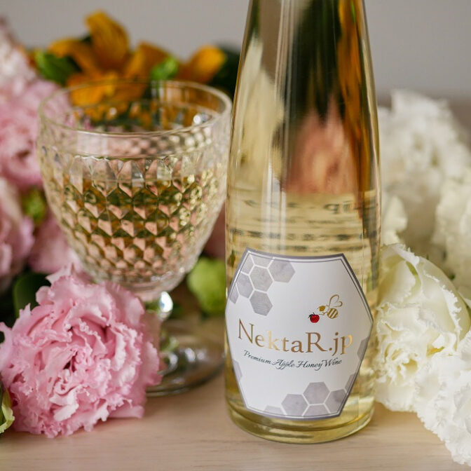 「林檎花ネクタル」は青森の林檎畑の花々から採れた蜂蜜を使い、水で希釈し、酵母で発酵させて造られたピュアなミード(蜂蜜酒)です。
